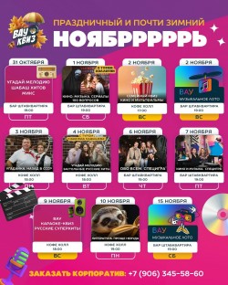 1 ноября — Кино. Музыка. Сериалы. 100 вопросов (с туром Хэллоуин) (Бар Штаб-квартира, ул. Юбилейная 8)